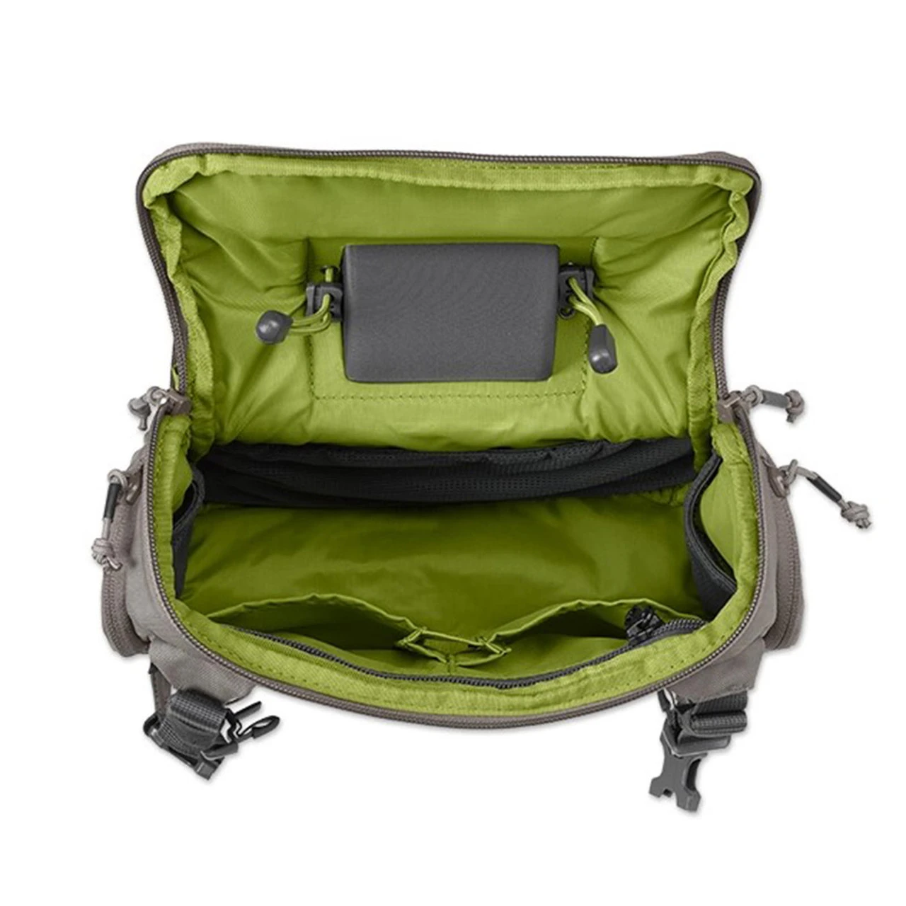 Put your workflow right in front. This capacious 4L chest pack provides a remarkably streamlined platform to easily manage on-the-water tasks with innovative new features and exceptional ergonomic design. The 100% recycled ECO CORDURA® Chest Pack has the new Tippet Whippet recessed docking station with a tippet bar included for instant, fixed, and fumble-free access for up to 6 spools. Large main compartment storage with a wide opening lid that flips down, out of the way to easily access contents. Zippered security pocket with key fob, front and side stretch mesh pockets for small sort storage, and additional backwall slip pockets. Front drop-down zippered pocket with internal elastic mesh slip pockets, and two external side pockets, one with a zinger/nipper pass-through port. Forceps dock on the front shoulder strap. The strap system is a comfortable an airy foam and mesh construction with a net D-ring on the top rear. Bug Out Backpack compatible for placement on the front straps of the backpack. 11″W x 7″H x 3 3/4″D. 4L/244 cu. in.
