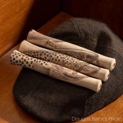 The Artist series offers two rod models; an H3 F 905-4 and an H3 D 908-4. Rod blanks are matte black; the 905 will come with an olive flag (butt section), the 908 with an ocean blue flag (butt section). Both rods will come with a special matte black rod tube with glossy black Helios 3 logo. The hours of painstaking work needed to create each Limited Artist grip is why this series is restricted the only limited dealers. TCO Fly Shop is proud to be among the few that will offer these rods.