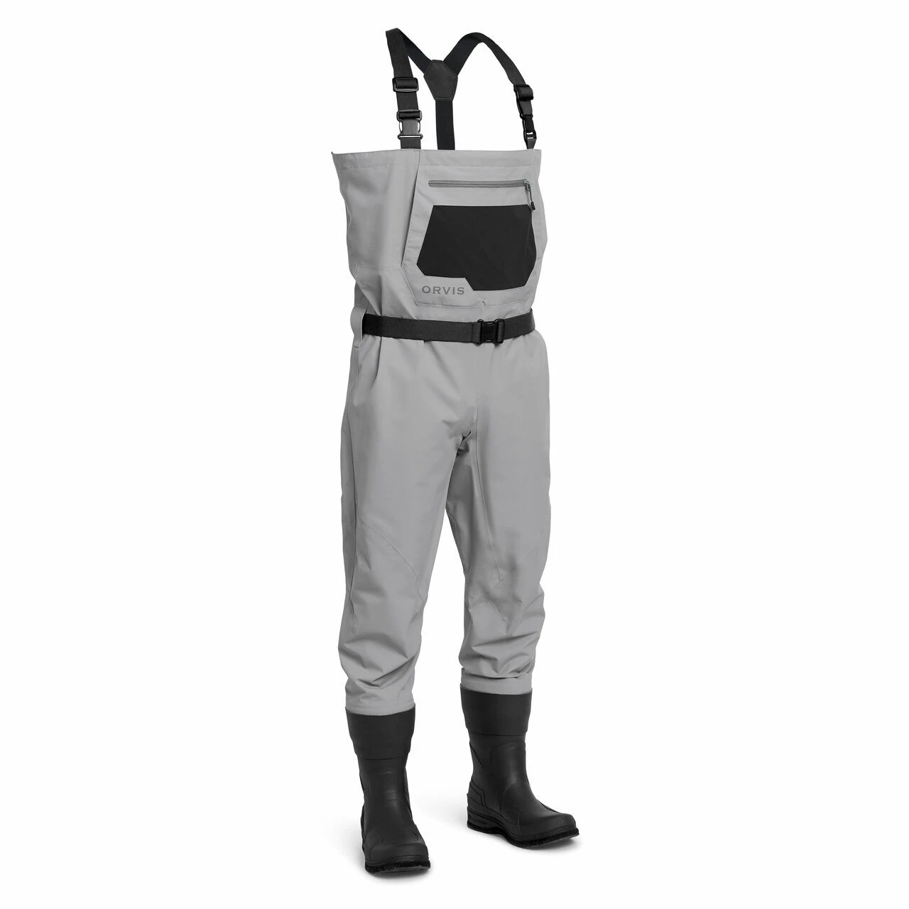 The Clearwater Bootfoot fly-fishing wader is a terrific value felt-soled option in an updated modern fit to eliminate traditional bulk. Four-layer waterproof breathable nylon fabric is light yet durable, with a 30K Waterproofness / 8K Breathability rating. Opposing side-release buckles allow for waist-high conversion on warm days. Vulcanized rubber neoprene boots provide optimal warmth. External storage pocket with stretch panel for small items and fly boxes, plus a kangaroo-style handwarmer pocket on the front chest. Low-profile seam construction and low-profile belt loops with 1½” webbing belt included. Hook and loop patch on interior pocket to attach Orvis waterproof pocket (8G3H sold separately). In stone.Nylon shell/polyurethane membrane/nylon tricot liner. Hand wash. Imported.