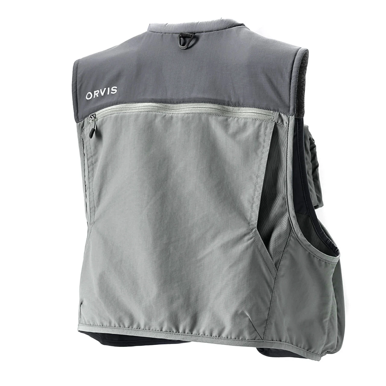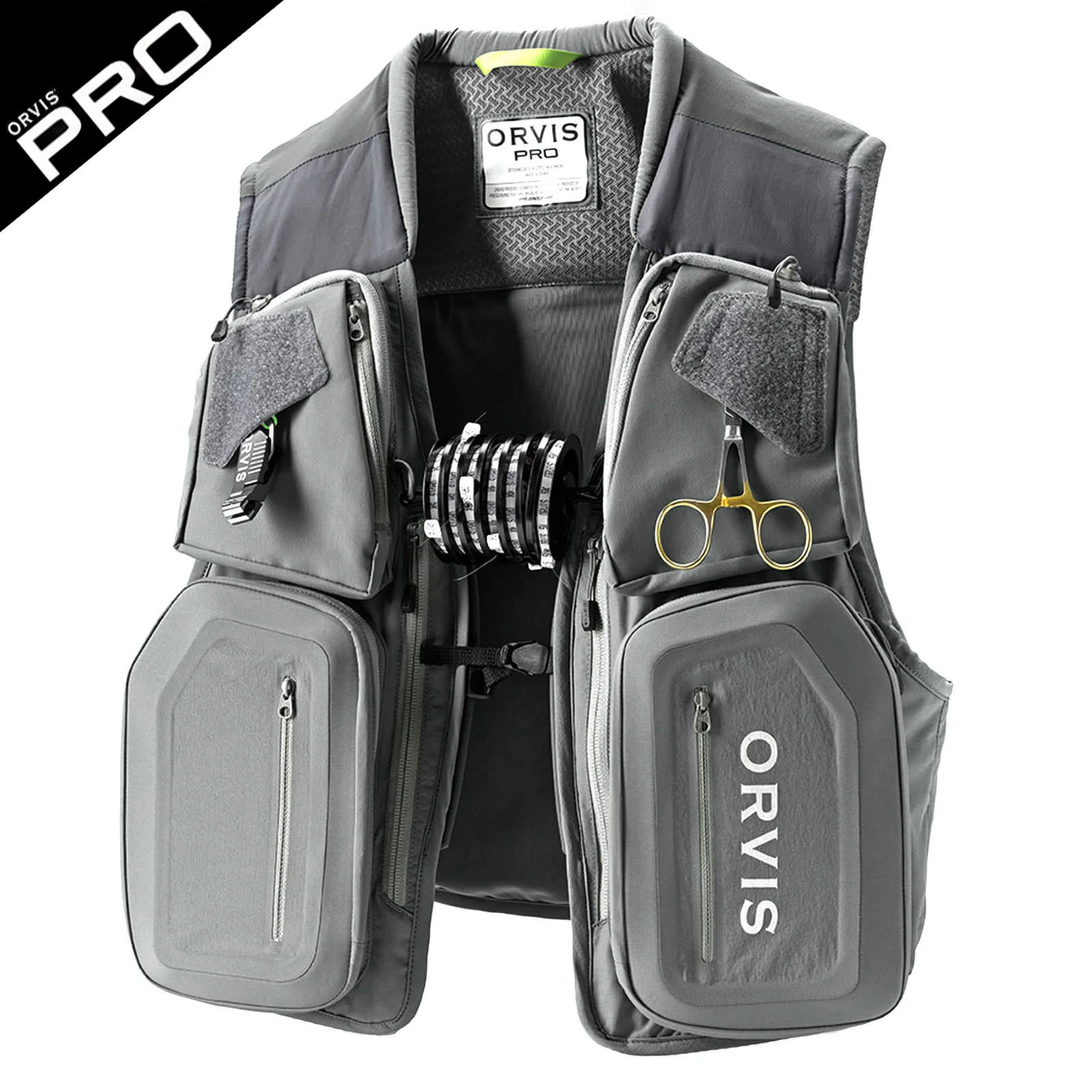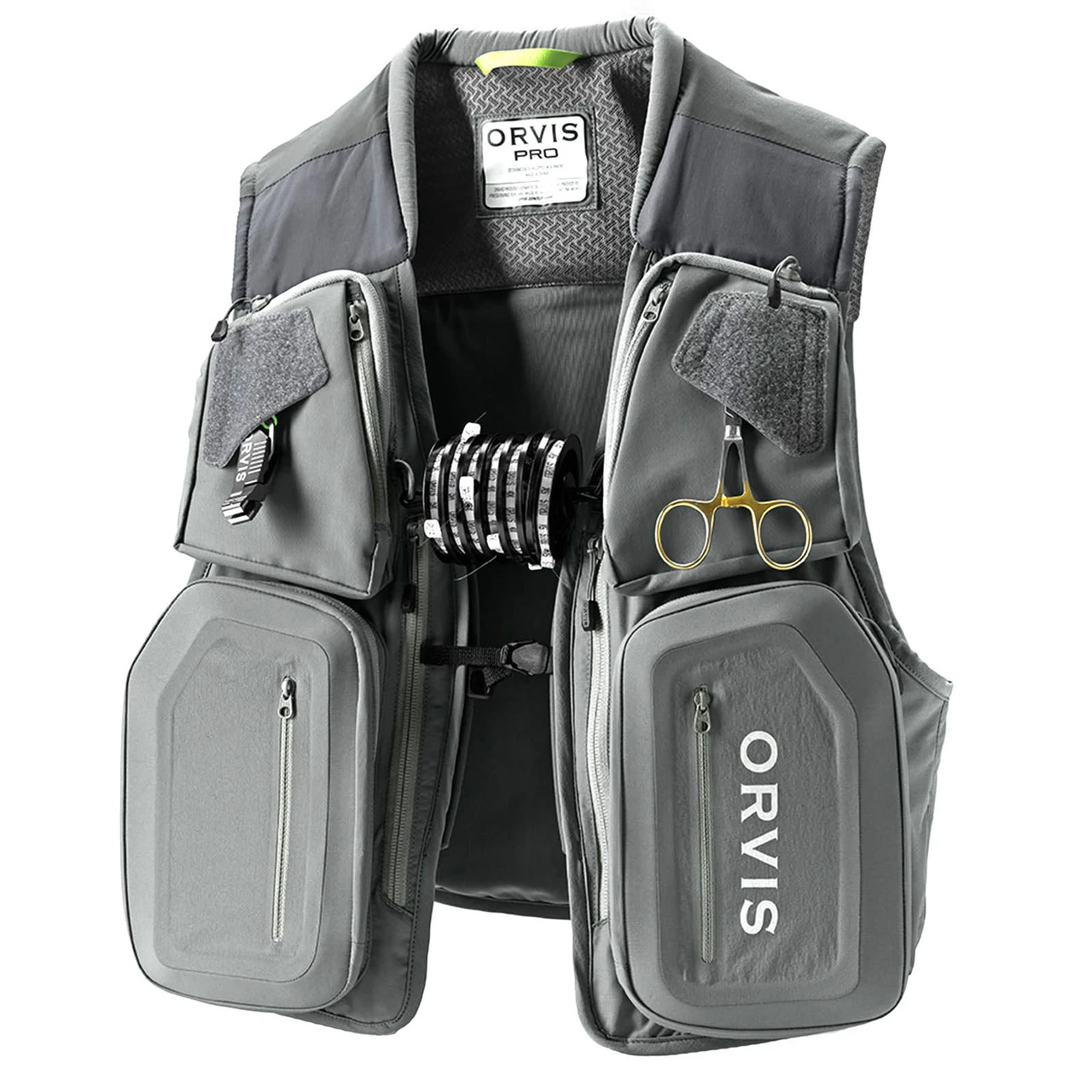 The PRO Vest is designed to carry everything you need, but is very light and breathes well for comfort. It is built of light, abrasion-resistant nylon with a DWR coating. The fitted design is built to conform to the body. The shoulders have a lofted spacer mesh of nylon and spandex. There are 18 pockets—10 exterior, 6 interior, and 2 rear ergonomically designed with new materials to provide organization coupled with smooth workflow on the water. The two lower main pockets offer compression-molded construction that add rigidity. The upper pockets are medium size, both with Orvis custom hideaway tool port underneath two fly-drying patches. The rear pockets offer a large pass-through game-style pocket under a full-zip rear pocket with mesh panel divider. Other features include multiple daisy chain gear loops, elastic loops to attach tippet bars, an adjustable closure that slides vertically for a custom fit, padded collar for comfort, internal webbing hanging loop, and a tri-ring net holder centered on the rear yoke. Shell: nylon. Collar and lower pocket: nylon/spandex. Upper interior mesh: polyester. Lower interior mesh: nylon/spandex. Molded pocket base: compression-molded EVA. Washable. Imported.Shell: nylon. Collar and lower pocket: nylon/spandex. Upper interior mesh: polyester. Lower interior mesh: nylon/spandex. Molded pocket base: compression-molded EVA. Washable. Imported. Sizes M(38-40), L(42-44), XL(46-48), XXL(50-52). 17½ oz. in medium.