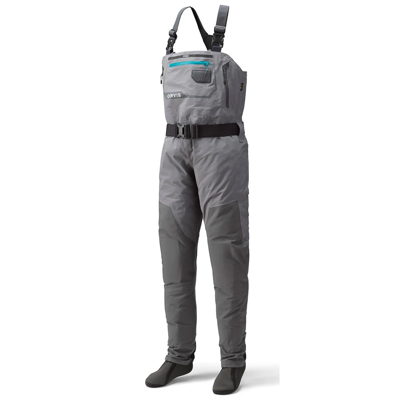 Storage and convenience is the name of the game when wearing the PRO Waders. There is an external storage pocket with YKK AquaGuard water-resistant zipper to keep your valuables safe and dry. The suspenders and front pocket boast rubberized tabs for tool storage virtually eliminating the chance of losing tools or puncturing your waders. There is a fly patch on the front pocket to quickly access flies for a quick change or allow drowned flies to dry. A large four way stretch mesh interior pocket accommodates large items and contracts to stay out of the way when empty. The kangaroo style handwarmer pockets are fleece lined and protected with YKK AquaGuard water resistant zippers. The knee pads are made of the same technically advanced material (OrthoLite X25) found in our PRO Boot insole providing optimal comfort. A removable accessory pocket offers the same advantages of a small pack and allows quick access to gear. The PRO Waders convert from chest high to waist high waders to keep you cooler when not chest deep in search of the ultimate lunker. The medium regular waders are a breezy 48 oz so they will not weigh you down. The Orvis waterproof pocket (8G3H sold separately) is a perfect addition to the PRO Waders and fits perfectly on the interior hook-and-loop patch. The PRO Wader is available in 14 sizes S-XXL including short and long sizes so you will have no issues finding the perfect fit. The PRO’s shell is made from 100% nylon with a polyurethane membrane and a 100% nylon tricot liner to keep you dry as a bone.