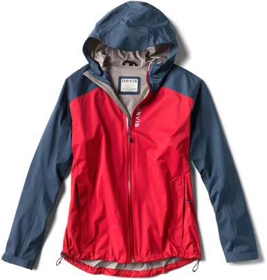The Orvis Ultralight Storm Jacket – Atlantic/Flag Red packs into your daypack or carry-on for anything from a sudden downpour to a constant drizzle. This jacket features a stretch 2.5 layer waterproof breathable nylon shell with raised dry-touch coating interior that increases comfort and air flow. Adjustable storm hood with laminated brim, cuffs with hook-and-loop closures, YKK AquaGuard water-resistant zipper, and a hem with dual cinches all combine to seal out the elements. Zippered pockets for essentials, and it rolls and packs into its own hood so it’s there when you need it, but stows away when you don’t. Active fit.